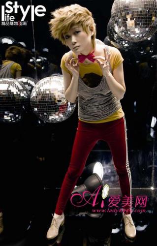 复古Disco的装扮,显得古灵精怪,李宇春某杂志大片中身穿这件黄色短袖T恤,配黑色横条背心、彩色运动裤,让人眼前一亮。