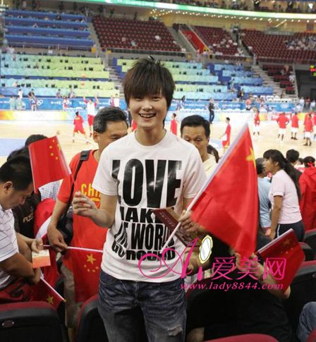 李宇春观看奥运篮球赛的着装,白色底,配黑色大字母。Love make the world go round,很符合奥运年的意境。