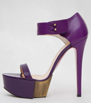 超过12cm的高跟设计因为厚底的前掌设计而看起来安全许多,简洁的襻扣设计并不显单调,因为厚底上紫色与金色的拼接部分低调地诉说着奢华的本质——less os more。