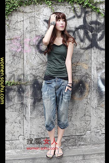 时尚解析:基础款简单背心搭配休闲七分牛仔裤,有点痞痞的街头气息,慵懒随意又不失清爽干净,搭个薄开衫,本季刚好穿。