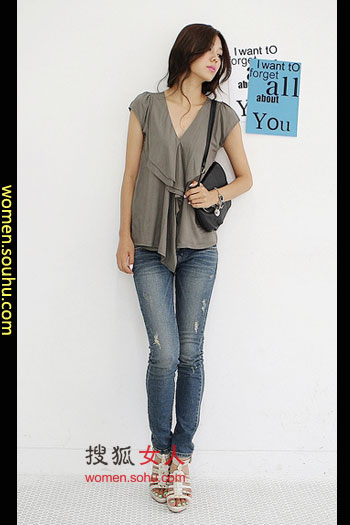 时尚解析:荷叶边T恤搭配紧身牛杂裤,既休闲随意又不失小女人的妩媚浪漫,慵懒的卷发更添女人味,牛仔裤演绎百种风情。