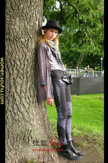 时尚解析:又是一位酷MM,全身都是深色系,唯一的亮色是丝巾,小礼帽显得中性风十足,有点朋克风,深色系使MM看上去很纤细。