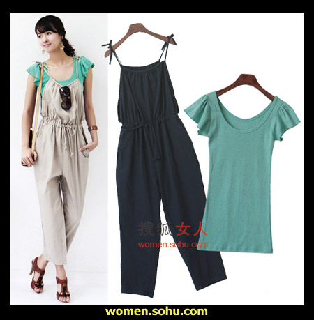 时尚解析:蝴蝶袖T恤衫,搭背带裤,休闲随意显甜美,这样的装扮适合办公室穿着,同时也适合约会,一天到晚不用换装。