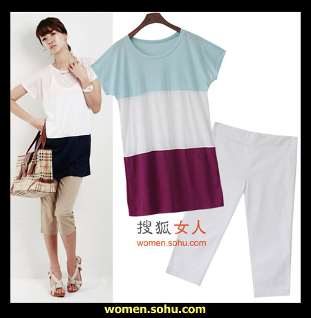 时尚解析:拼接色是今年火爆的流行元素,拼接款中长T恤搭配简单的七分裤,使整体层次感丰富,清新爽朗的通勤打扮。