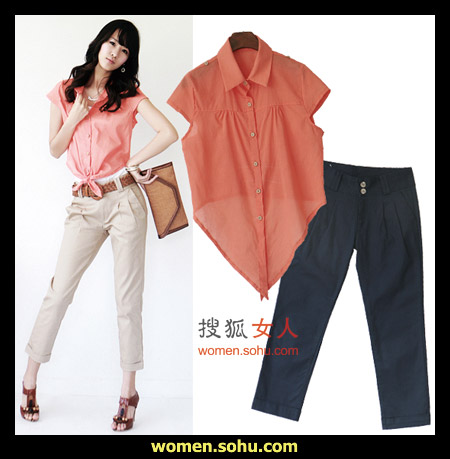 时尚解析:抢眼的橙红色系腰衬衫,搭配九分裤,刚好适合本季穿着,腰间系个蝴蝶结,可爱俏皮显身材,配双高跟鞋突显个性。