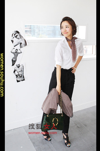时尚解析:清爽的白衬衫,V领设计使脸部看着更小巧,配以同色系的丝巾与西装外套干练简洁,小脚裤是身材曲线更流畅。