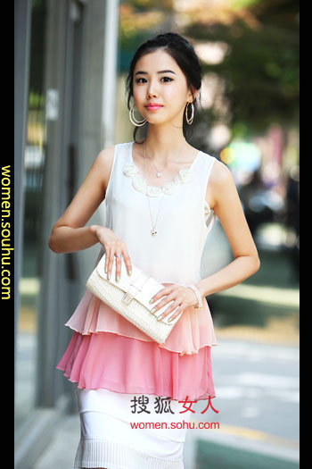时尚解析:选择暖色调,粉色和白色搭配在一起,既能吸收掉肤色中的黄,也能让肤色更加有光泽,浅淡的妆容更加完美。