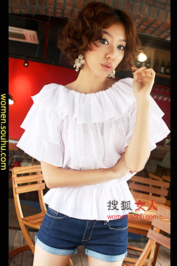 时尚解析:宽松的五分袖可以很好的掩盖胳膊肉肉的缺陷,再加上胸前的层叠设计更加体现女人的妩媚,使上围看上去丰满,搭配牛仔裤清爽时尚。