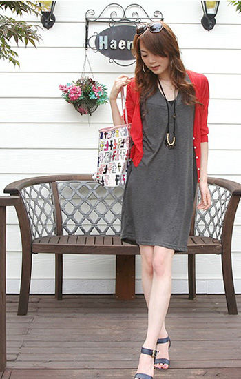 鲜艳的红色针织外套你同样不能错过。伴有小纽扣装饰增添了可爱的感觉,搭配深灰色连衣裙从色调搭配来说简直就是绝配,即保险又出彩的搭配。