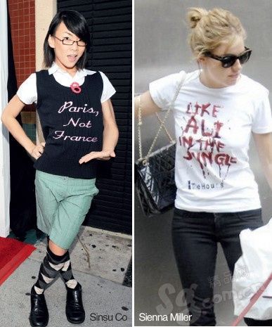 文字T恤可以说是所有T恤里最能告白穿着它的明星的心情的。当Sienna Miller穿着血书一般的T恤出街时,或许狗仔们看见了都得让她三分!