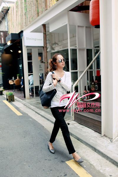 灰白条纹针织衫更具知性美,搭配黑色长裤效果更好!