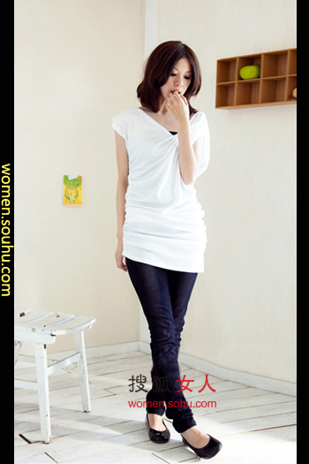 时尚解析:纯白色长TEE加修身牛仔裤,V领设计视觉上缩小脸部,拉长脖子,看起来非常有气质,修身仔裤使下半身更纤细。