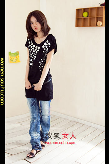 时尚解析:同样经典的黑色长TEE与牛仔裤搭配,闪片装饰使MM看起来非常有精神,细细的皮质腰带完美的风割身体比例。