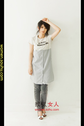 时尚解析:假两件长T恤搭配紧腿裤,上衣上半为字母T恤,下半为衬衫设计,适合多变的美眉们,无论想穿什么,一件即可解决。