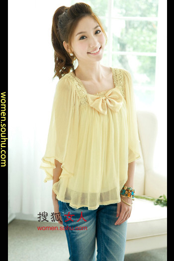 时尚解析:七分袖嫩黄色雪纺衫搭配牛仔裤,简单清新的优雅,蝴蝶袖设计很好的遮盖手臂的肉肉,胸前蝴蝶结增添可爱气息。