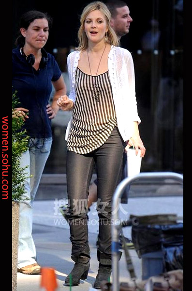时尚解析:竖条纹T恤虽然简单,但和仔裤搭配的确是最醒目的装扮,随意中性感流露,牛仔裤与高跟鞋搭配完美,起到拉长腿形的作用。
