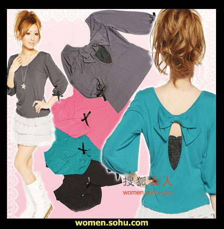 时尚解析:七分灯笼袖T恤,背后镂空,蝴蝶结使性感中多了一点甜美可爱气息,搭配蛋糕裙很不错哦,也可以配长裤。
