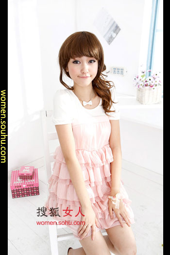 时尚解析:淡淡的粉丝雪纺层叠蛋糕裙,搭配白色打底小T恤,瞬间变身甜美女孩,令你的他倍升恋爱之心,美翻天。