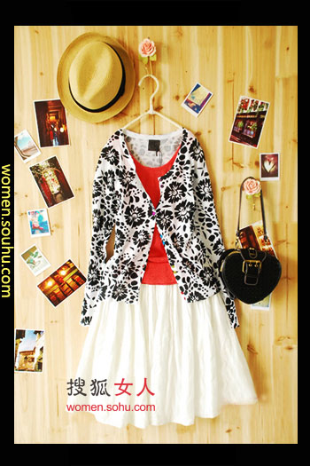 时尚解析:黑白红永恒经典的颜色搭配,红色基本款小T恤搭配白色裙裙,十分亮眼,罩一件白色印黑花小外套,优雅可人。