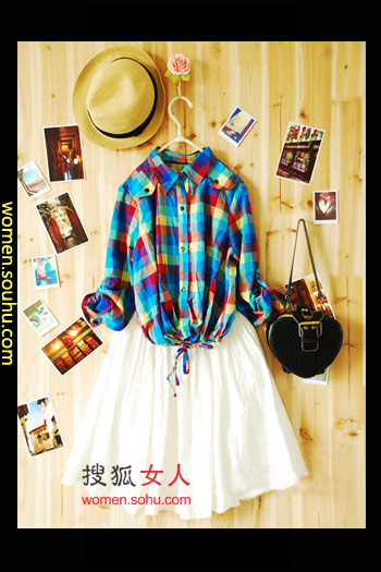 时尚解析:亮丽的多彩格衬衫搭配纯洁优雅的白色长裙,使颜色集中与上半身,吸引住他全部注意,黑色心形包包更添可爱。
