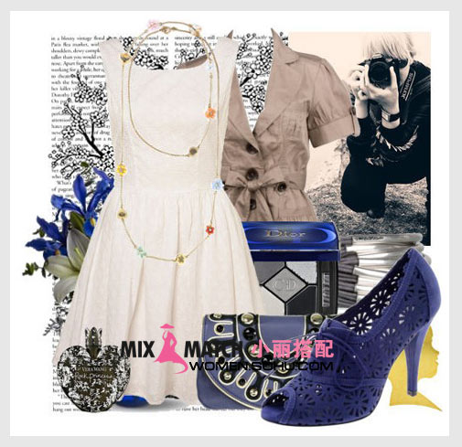 搭配解析:连衣裙是清纯的代表,白色当值首选。外搭一件卡其色单排扣短袖风衣,令人回味。镂空图案高跟鞋,时尚感强烈,颇具东方感。