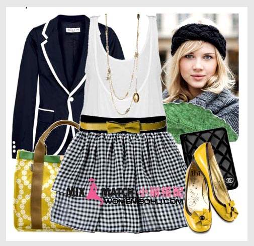 搭配建议:假两件裙+白色格纹短外套+漆皮平底鞋