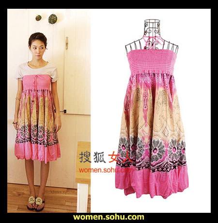 时尚解析:盛夏的印花抹胸连衣裙内搭白色打底T恤,七夕约会装扮简单呈现,胸部的松紧设计很好的包裹出女性柔美曲线。
