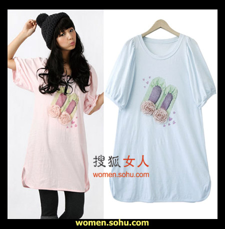 时尚解析:单纯可爱的T恤款连衣裙,搭配黑丝袜加高筒靴,无比甜美,惹人怜爱,桃花定会朵朵开发,胸前装饰花朵成为点睛之笔。