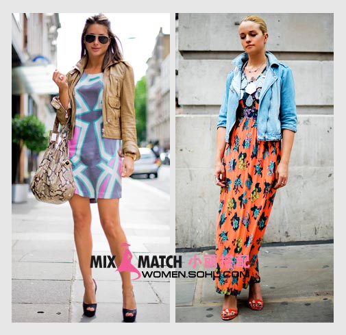 连衣裙外加小夹克是夏秋换季的最佳选择,既免除了单穿连衣裙特别是无袖或吊带裙装的不正式,又不会像西装套裙那样容易热和死板。机车夹克外套并不那么正式,搭配图案连衣裙不但休闲十足,还令颜色清新雅致,给人优雅感。