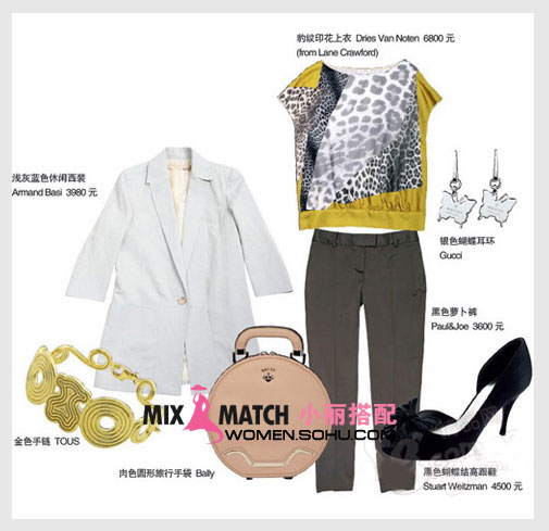 搭配建议:五分袖的长款西装是本季大热的潮流单品,搭配略正式的黑色萝卜裤,干练之余又显得摩登十足,内搭豹纹上衣,小露野性美感。