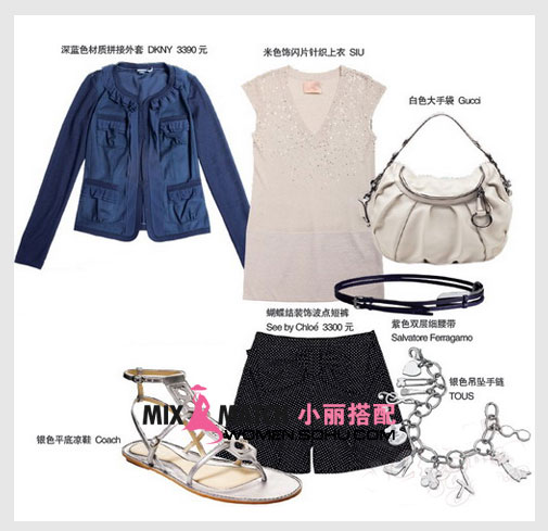 搭配建议:V领周围散落着闪片装饰的针织背心,散发微微的华丽味道,搭配黑白波点的大蝴蝶结短裤,穿双平底凉鞋,让你看上去轻松俏皮又自然舒适。
