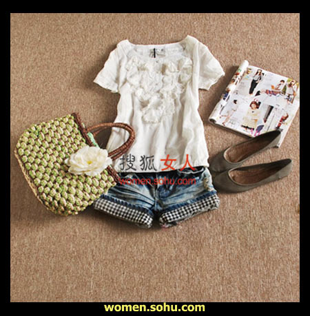 时尚解析:淡蓝色小碎花黑边抹胸背心,复古味道浓郁,黄色小开衫使整体活泼生动,搭配牛仔短裤,休闲淑女风。