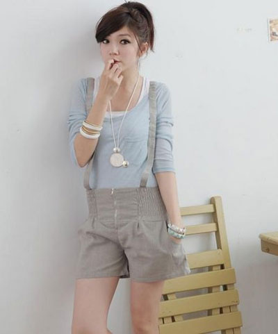 时尚点评:白色背心内搭小可爱,加上天蓝色中袖上装,简单自然又不失时尚,搭配灰色背带高腰短裤,俏皮中彰显你独特的个性,不要忘记搭配一条可爱而且略带夸张的项链,补充素色上装的单调。