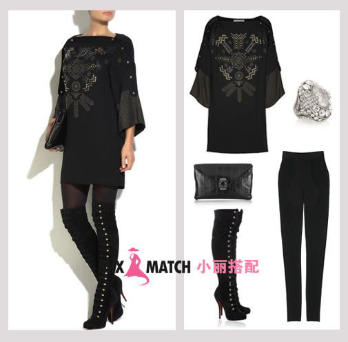 时尚解析:简单的中长款T恤,内搭打底裙,露出里层雪纺裙边,顿时生动起来,加上铆钉构成的图案,给人视觉上的冲击力,忽略身上的缺点,完美的分割身材比例。虽然是全黑的搭配,本来黑色就是显瘦的色彩,显得上围纤瘦,黑色是最强收缩色,突显腰部纤细,搭配即将流行的铆钉靴,时髦穿搭。