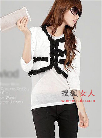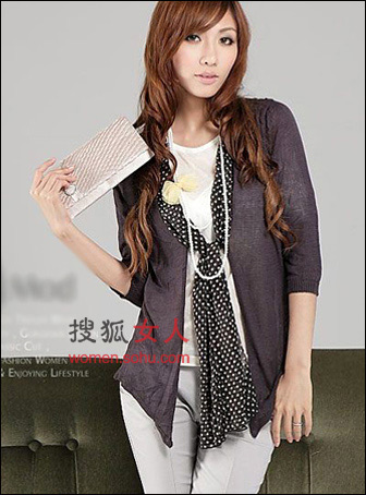 时尚解析:样式简洁轻盈的薄衫未免显得有些单调,配上与之相连的围巾即可成就上成之作。黑底白点的围巾点缀了素雅,宣扬了大方与稳重。