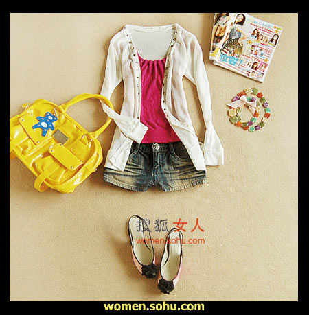 时尚解析:纯洁的白色显得素雅干净,搭配粉红色圆领衫和牛仔热裤,甜甜的小女人味(女人味博客,女人味说吧)道立刻洋溢出来,亮黄色包包增添甜美度。