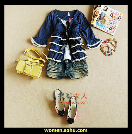 时尚解析:很少见的最新款小外套,层层叠叠的设计用白色边缘加以强调,好像蓝莓蛋糕般可爱,内搭白色打底小背心既可。
