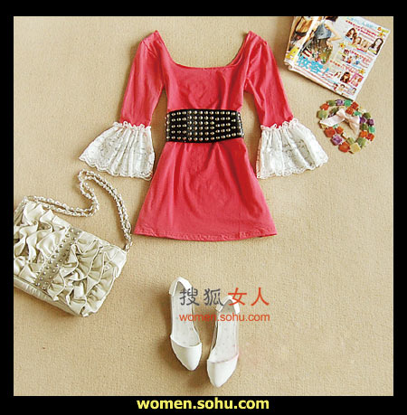 时尚解析:粉红色的连衣裙外套可以显出女孩的俏皮可爱,白色蕾丝蝴蝶袖与黑色宽腰封点缀,突出了跳跃性。