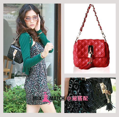 搭配亮点:金属链菱格纹手袋,不要认为只有某些品牌专属,只要是好的产品,就应该所有女性来分享。柔软的皮质,搭配金属链,刚柔相济,而且易搭程度100分,在整体造型中,起到很好的锦上添花效果!