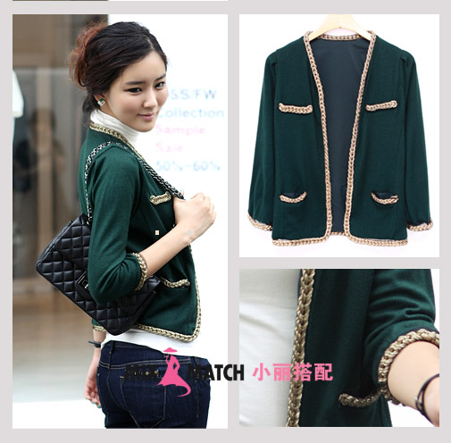 品味细节:在金色编织装饰与针织衫的衔接处,巧妙使用柔软的黑色蕾丝做过度,增加了整件针织衫的垂坠感,使上身的版型更为端正有型!