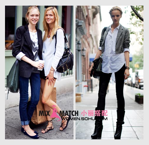 人手一条的百变仔裤,怎么穿都洋气时髦。小脚牛仔裤搭配长款或短款小西装,充满自在舒适的感觉。内搭白色打底背心,使整体层次感丰富,干净利落。加入本季大热的铆钉小挎包,令你的时尚气质顿时飙升。