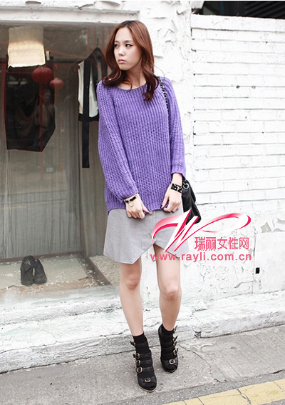 青莲色的宽松针织衫,休闲随意,柔和的色调,重叠穿着非常适合。略带厚度,有一定保暖效果。长短适中,比较宽松,略带垂感!