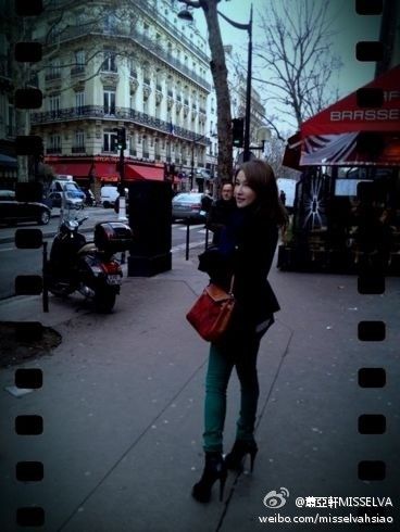 潇洒小姐萧亚轩(微博)游巴黎,黑色外套搭配墨绿色小脚裤,搭配红色小包,谁说不能红绿配