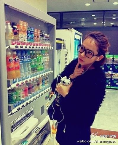 戚薇(微博)在便利店挑饮料的戚薇,黑色毛毛外套搭配超大黑框,很有型。