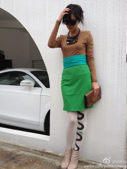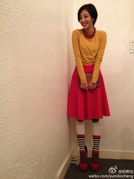 郑希怡黄色与红色的撞色搭配,更抢眼的是脚上的条纹袜,郑希怡的这一身真的很潮。~