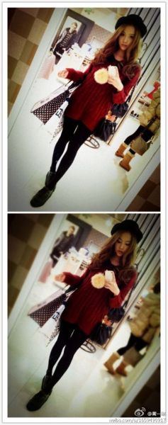 逛街,穿上宽松的红色毛衣,黑色打底裤,戴上黑色礼帽,甜美又不失个性。