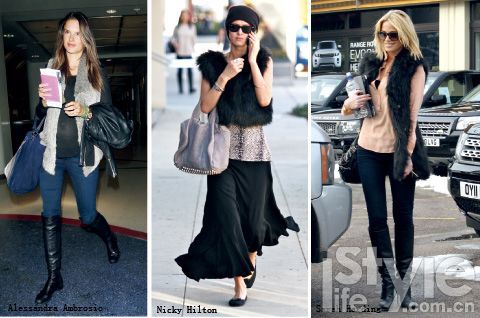 对于超模来说,一切简单款都是为她们的好身材服务的。长款的皮草背心不但有保暖、时髦的功能,对辣妈Alessandra Ambrosio来说,还有产生错觉、遮盖住隆起腹部的作用。