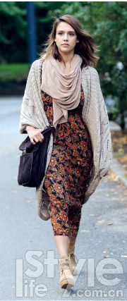 虽然并不追求令人惊叹的“奇异美”,但是Jessica Alba绝对追求美丽与舒适之间的平衡。比如这套街拍,姜黄色的裤子和粉色棉布围巾负责醒目,高筒靴负责舒适,褐色针织斗篷则两层功效兼具。