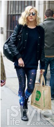 Fearne Cotton 男孩子气的中性皮袖卫衫搭配粗线毛衣,潮爆leggings上的浩瀚星空打造出英伦轻摇滚风格。