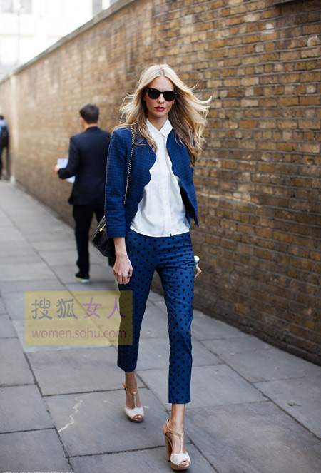 编辑解析:这款轻薄的短外套最吸引人的莫过于波浪边的剪裁了,为典雅的短外套添加了活泼生动的感觉,不再显得死板。白衬衣加波点9分裤的加入,整套穿搭简洁干练,微露的脚踝和坡跟凉鞋看上去有些性感的味道。